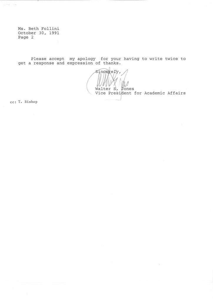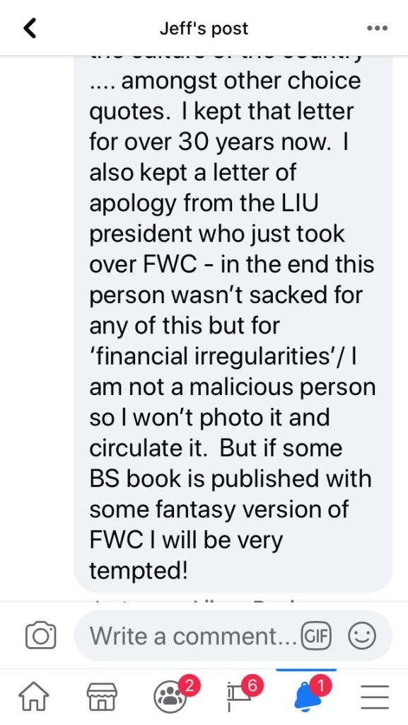 A few days ago, we questioned whether Jeff was the best person to lead on a book celebrating FWC/FWP. We had hoped for an acknowledgement that mistakes were made but lessons had been learnt. Instead we were met with doubling down & accusations of spreading rumours. I initially wanted to run away & hide. But when I re-read a copy of my initial complaint letter that I filed away all those years ago, I realised that my younger self had nothing to be ashamed of and I have nothing to be embarrassed about now. Those that were adults & in positions of authority at the time should pause & reflect whether they enacted their duty of care to students. Linda Yarr was the only adult and member of staff who reached out to listen and support me – thank you Linda. And thank you to the other young women at the college who were there and had their own trials that they went through. I have just posted scans just three of the letters I kept in an archive box all these years: My initial letter of complaint (undated but sent in May 1991), Jeff’s response and the response of the Vice President of Long Island University at the time, Walter Jones.