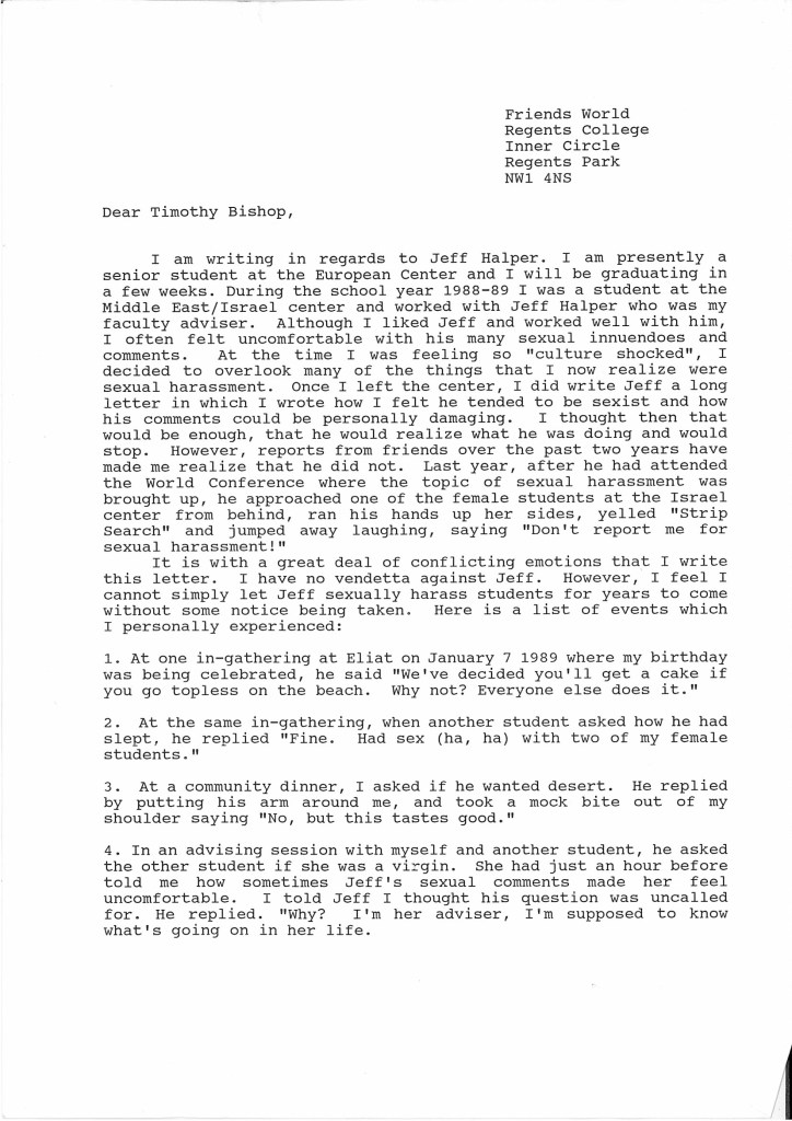 Those two years after I left the Israel center allowed me to consider and process what had happened when I was an 18/19 year old in her second year of university. In London, I did an internship at Women Against Sexual Harassment and that gave me the words to express what had happened. I had kept personal journals throughout all my time at college and I could go back and pick out the most painful and uncomfortable incidents. I told Linda Yarr at the North American centre all about what happened and she supported me to write the letter and send it.