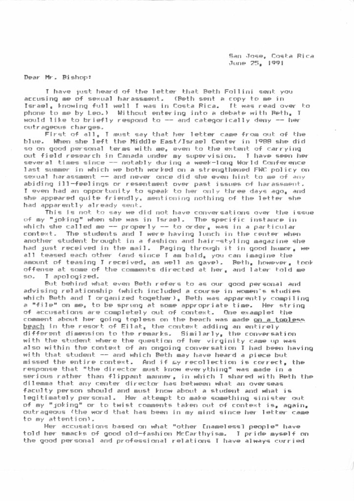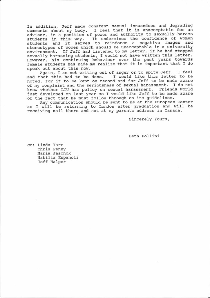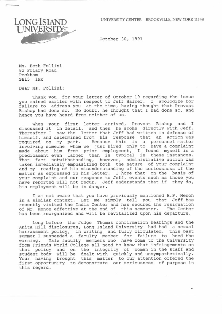 After I received this, I heard nothing from LIU. LIU had recently taken over Jeff’s employment and had actually promoted him to interim Director of the whole FWP. So, I wrote to LIU. I didn’t keep a copy of this letter but in it, I pointed out that the Anita Hill hearings were going on and sexual harassment is now a legal issue. I then got this letter.
